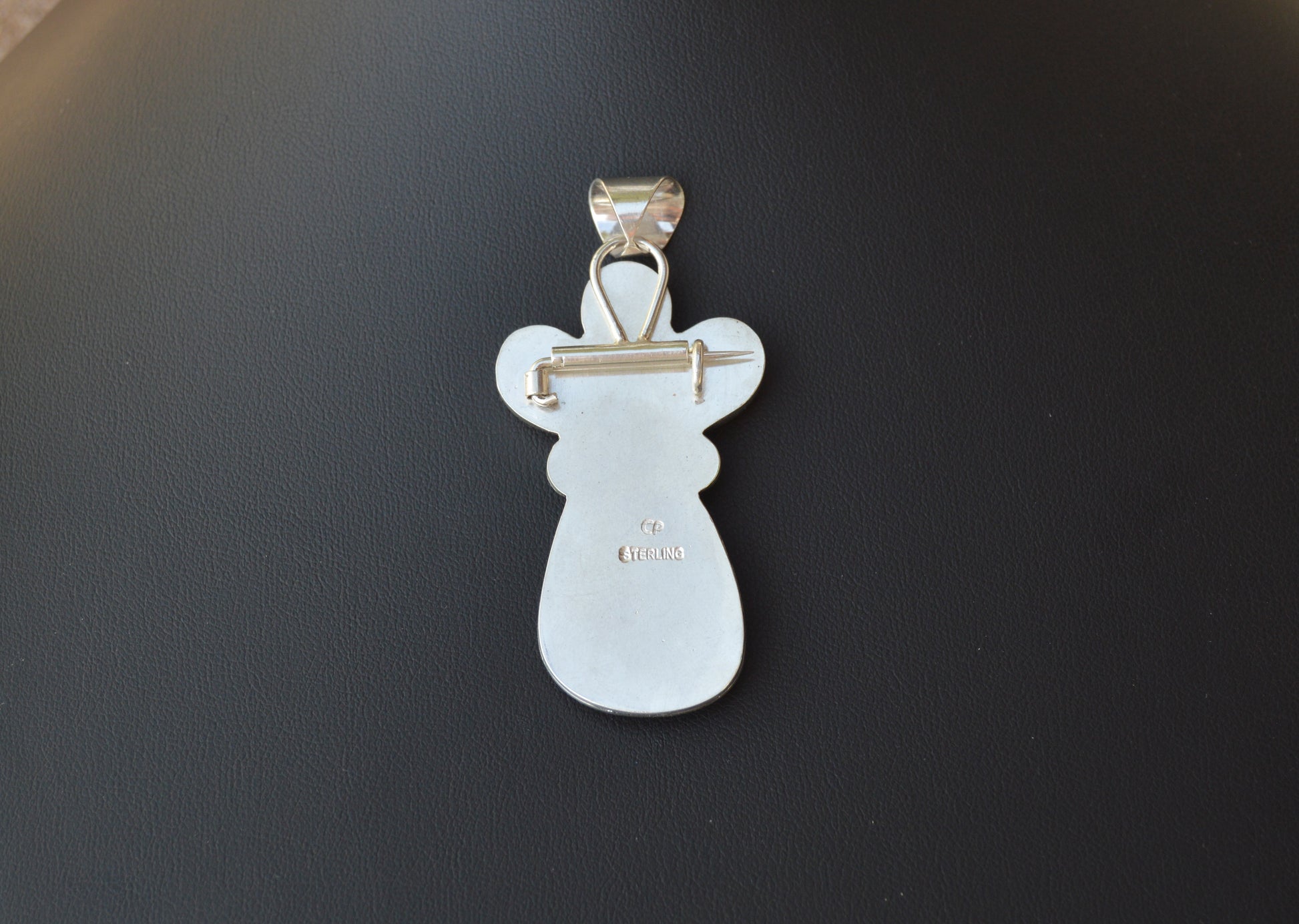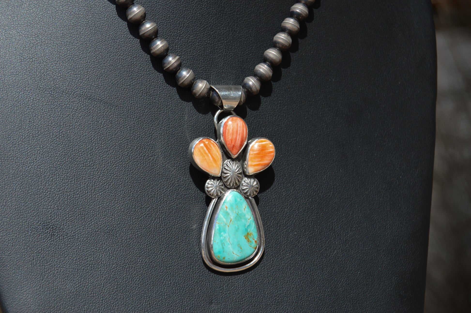 I just love a good convertible piece! Here is a pretty piece of Chilean turquoise surrounded by some really nice red and orange Spiny Oyster, all set in sterling silver. It also features some sterling accents and a solid wire border. This piece is built as a pin, but comes with a bail converter, so it can be worn as a pendant as well. The bail will fit beads up to approximately 7mm. The full piece measures 2.25" long by 1.25" wide at its widest point.