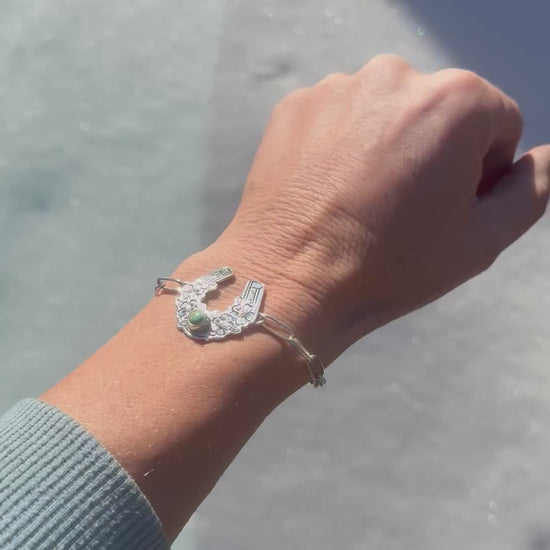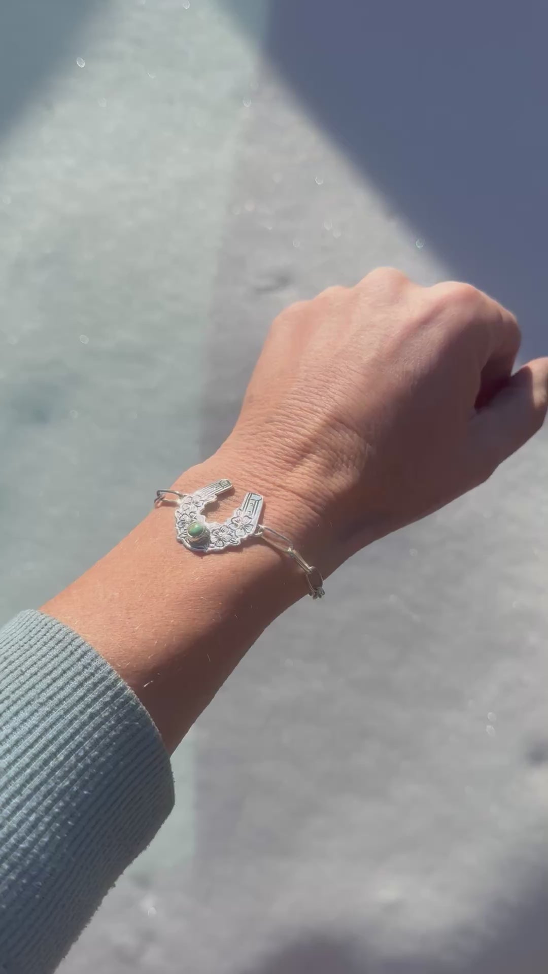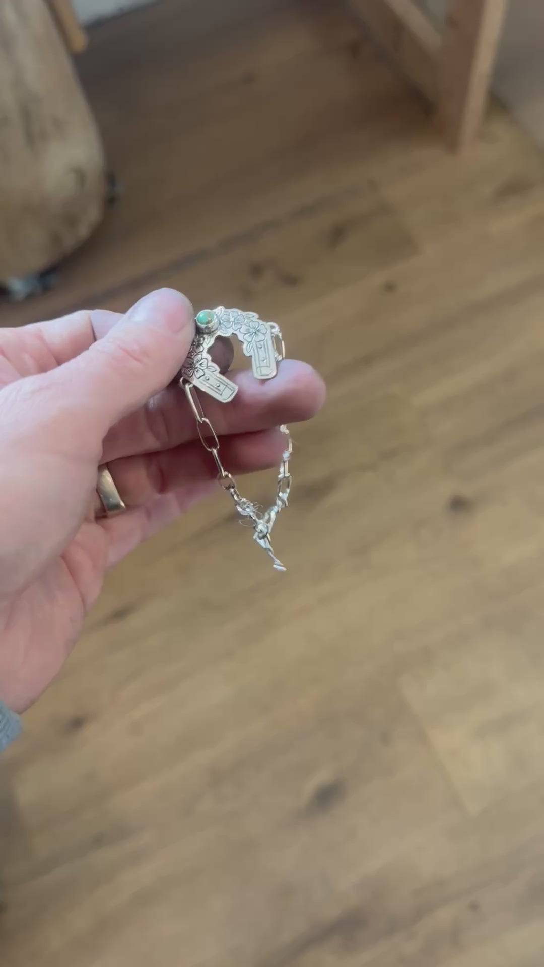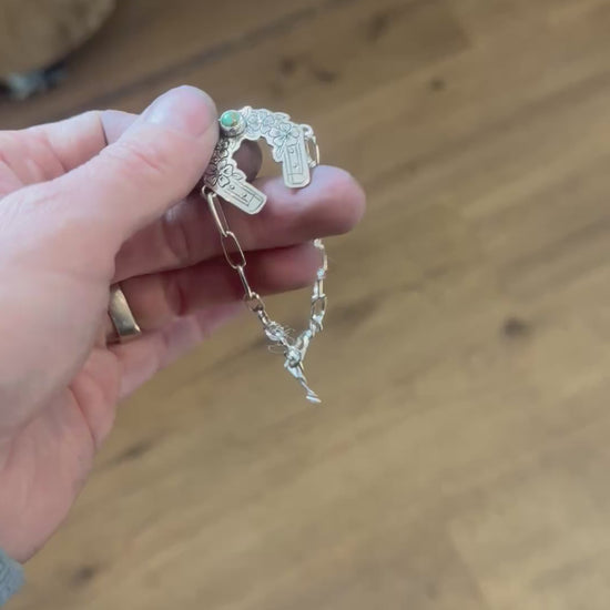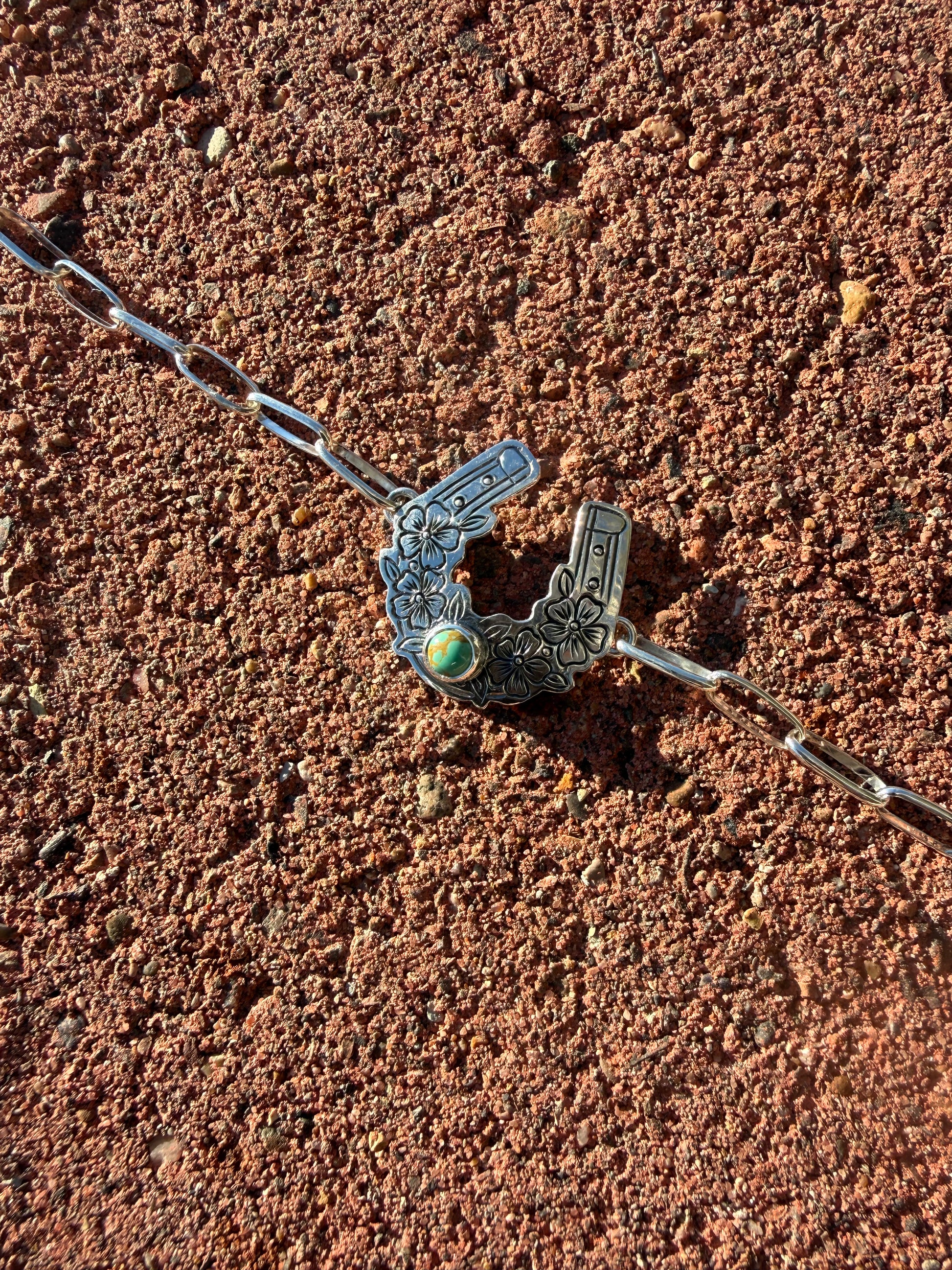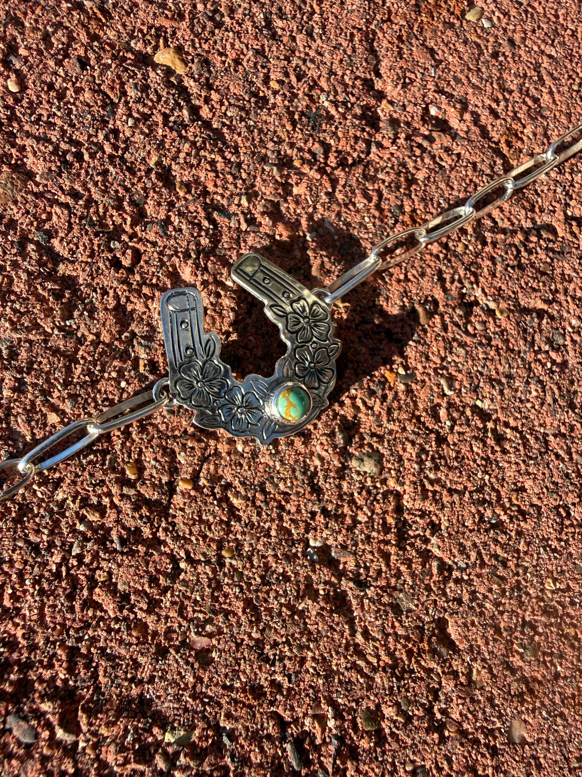 This sterling silver hand engraved horseshoe design features a Tyrone turquoise accent and comes on a handmade paperclip chain with a toggle clasp. The total length is just over 8" and the horseshoe measures 1" by 1". This can be shortened by request.