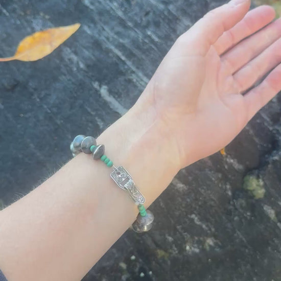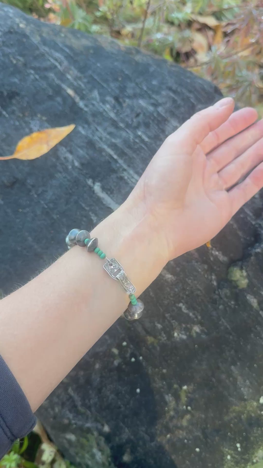 Handmade Silver Bead Bracelet with Turquoise & Engraved Clasp