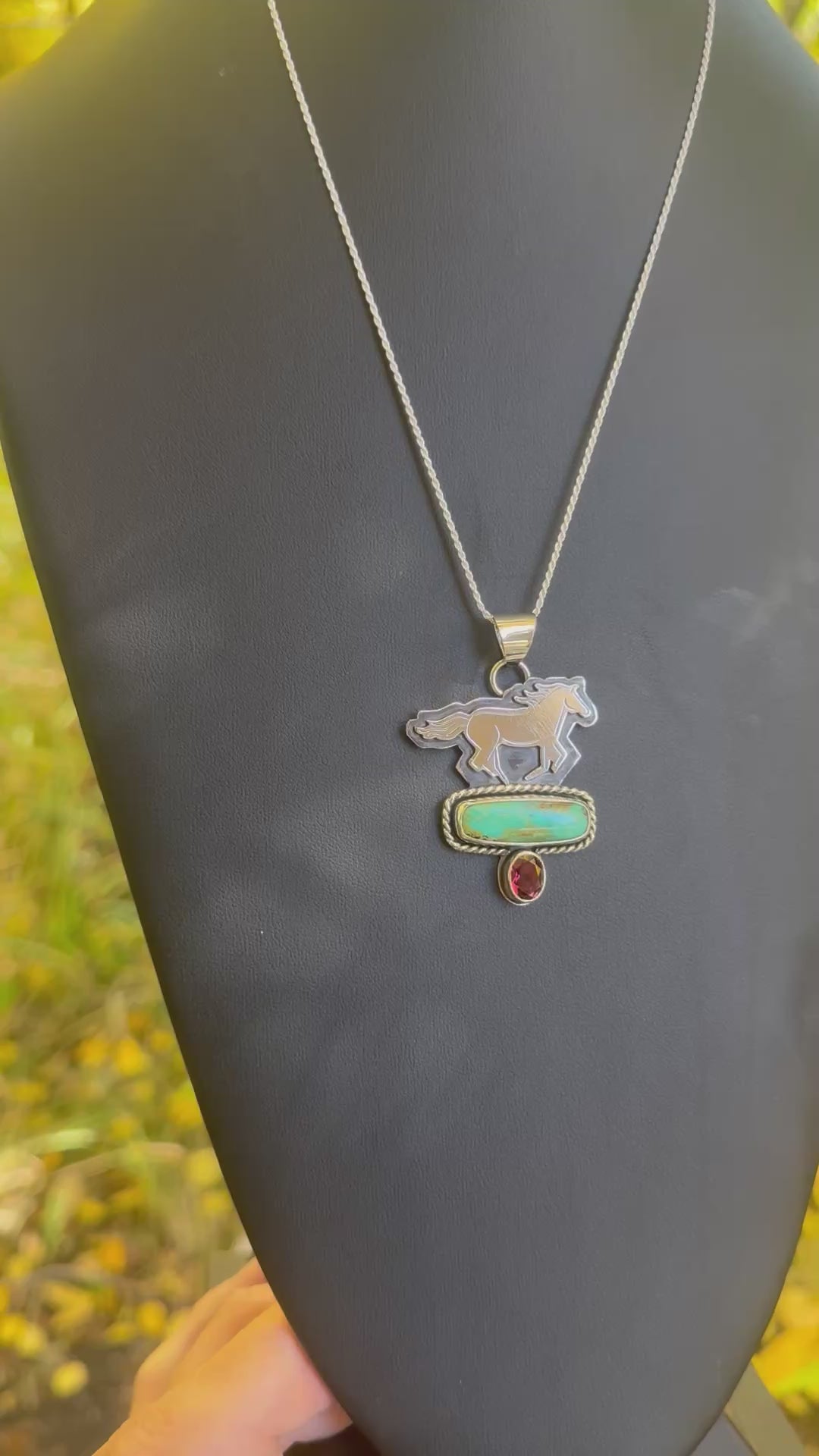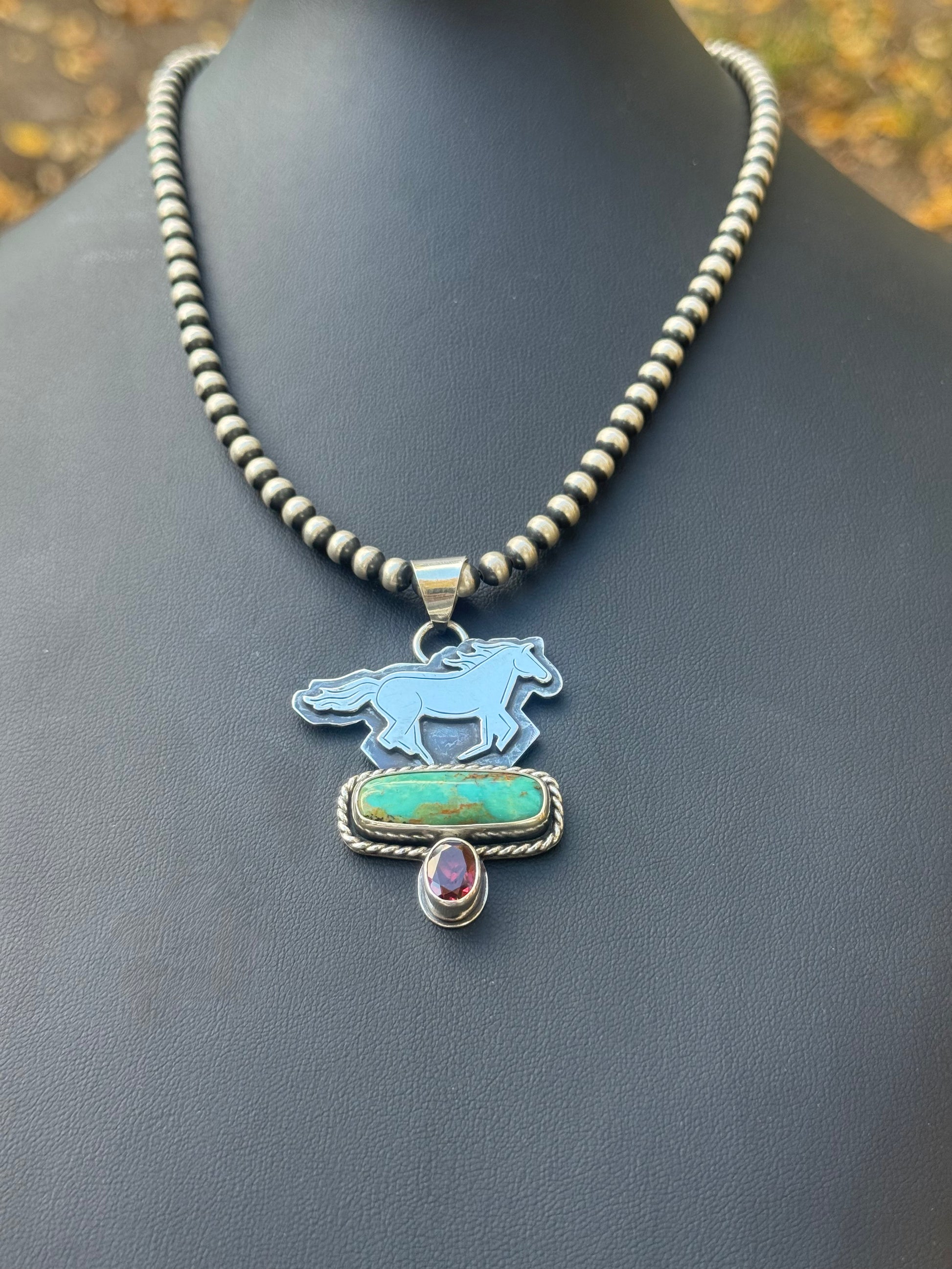 This necklace features a running horse with pretty Skysong Turquoise & a purple/red Rhodolite Garnet. All set in sterling silver with an antiqued finish to add some dimension. You may purchase the pendant and 20" sterling silver rope chain, or just the pendant only. The bail will fit beads up to 6-7 mm. *This does not come with the navajo pearls pictured*