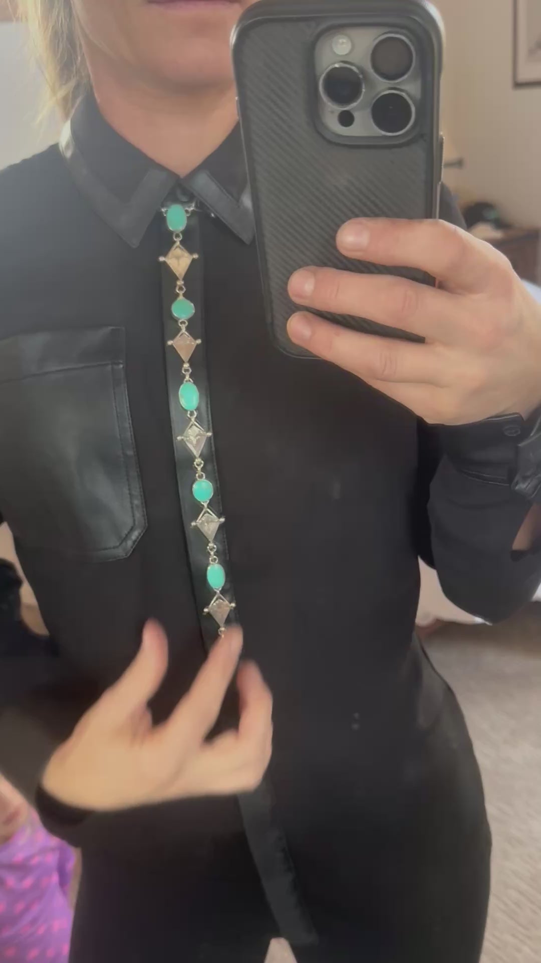 A fun western spin on the idea of a "tie" that can be worn with a button up blouse for the cowgirls. This is piece features eight stones of Sonoran Turquoise with multiple hand engraved diamond shape links in between. The length of the drop is 11.25" and the neck portion is adjustable and can go from approximately 14" to 18.5" which allows it to be worn up close, or lengthened for a more relaxed fit. This is an elegant piece that will elevate any outfit!