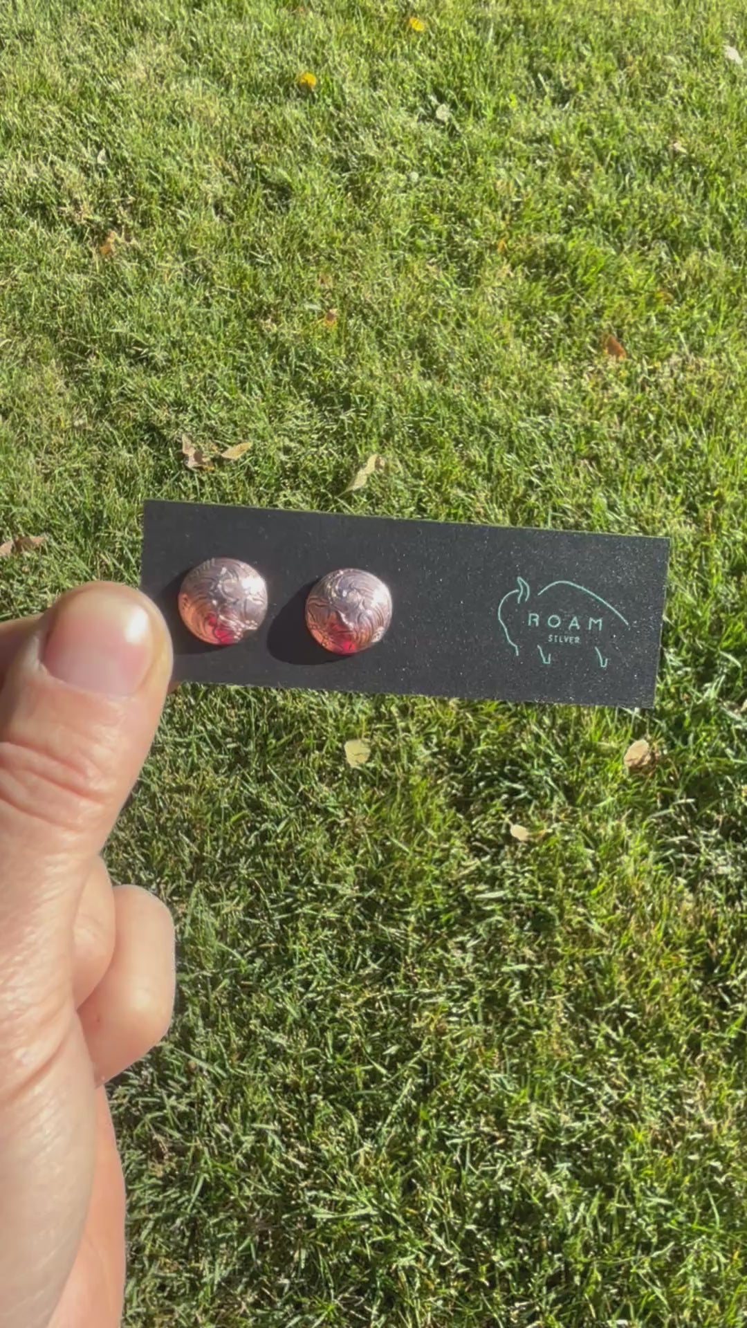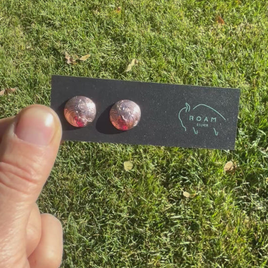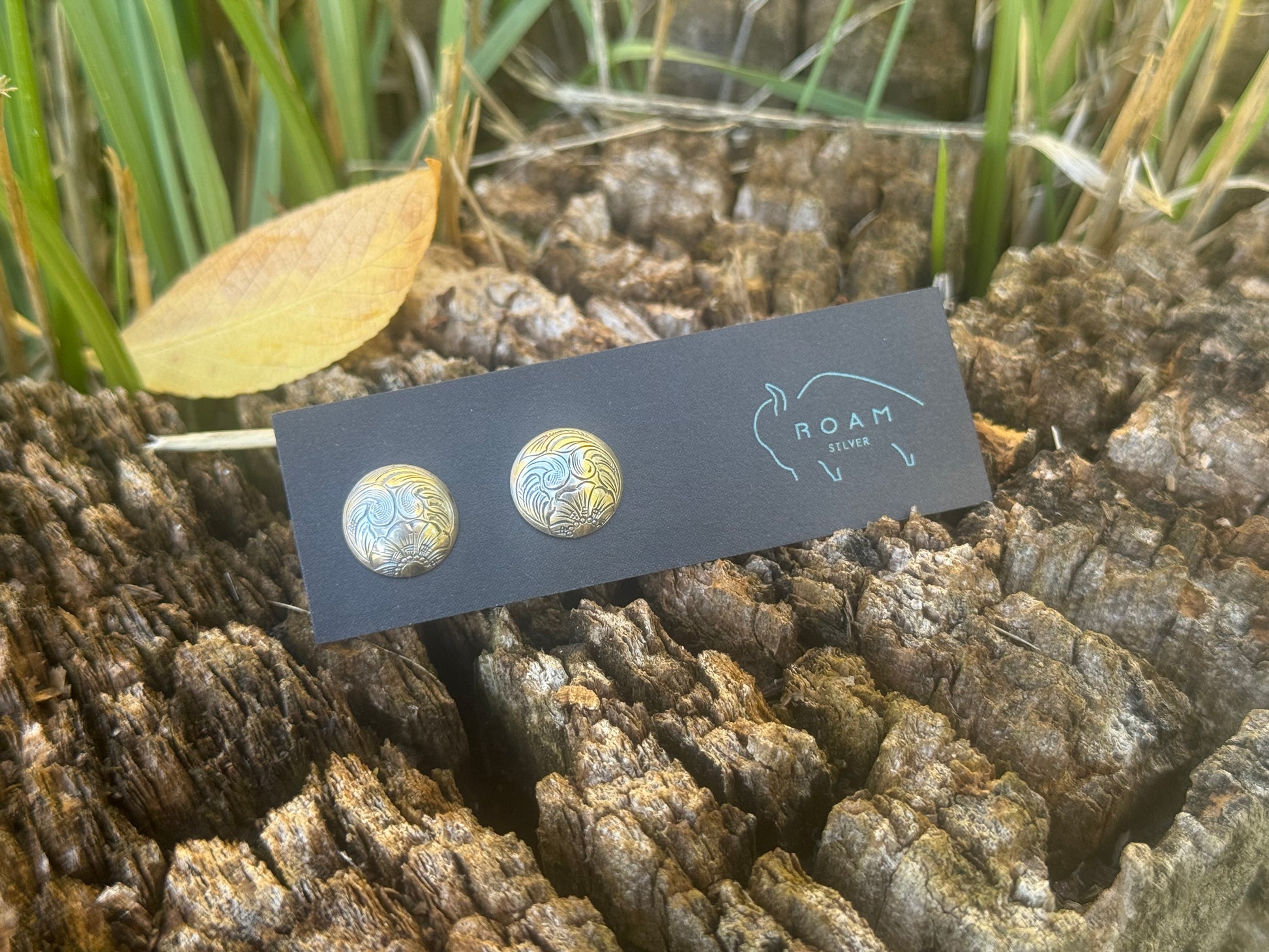 These hand engraved sterling silver studs are perfect for everyday wear on the ranch, in the gym, to the office, on the trail, at happy hour and beyond! They measure 1/2" in diameter. Please select preferred design and metal type below.
