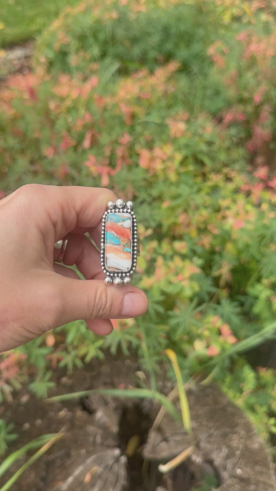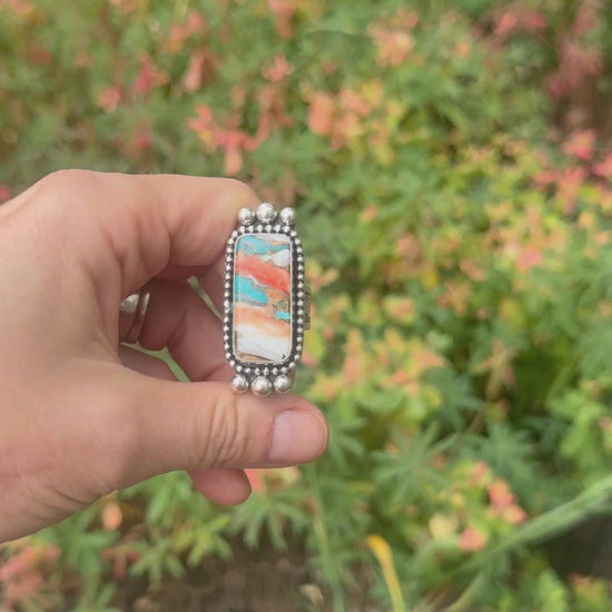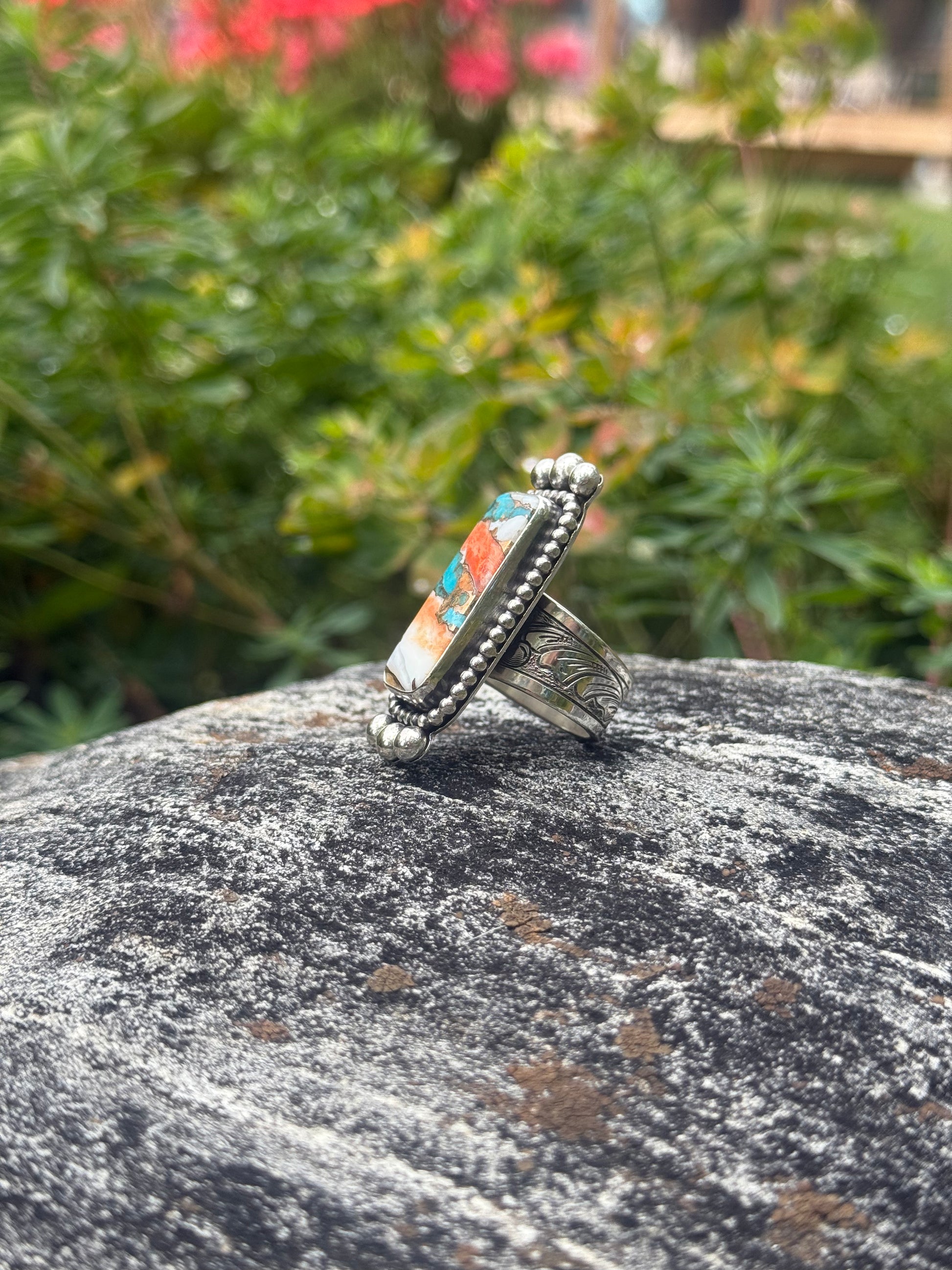 Here is a bold statement piece! Turquoise, Spiny Oyster & Bronze highlight this stone, which is set in sterling silver and has a bead wire border with sterling accents. The heavy tapered band (16 gauge) is hand engraved to finish it off with some extra flair. This ring measures a size 7.75-8 and the face is 1.75" long by .75" wide.